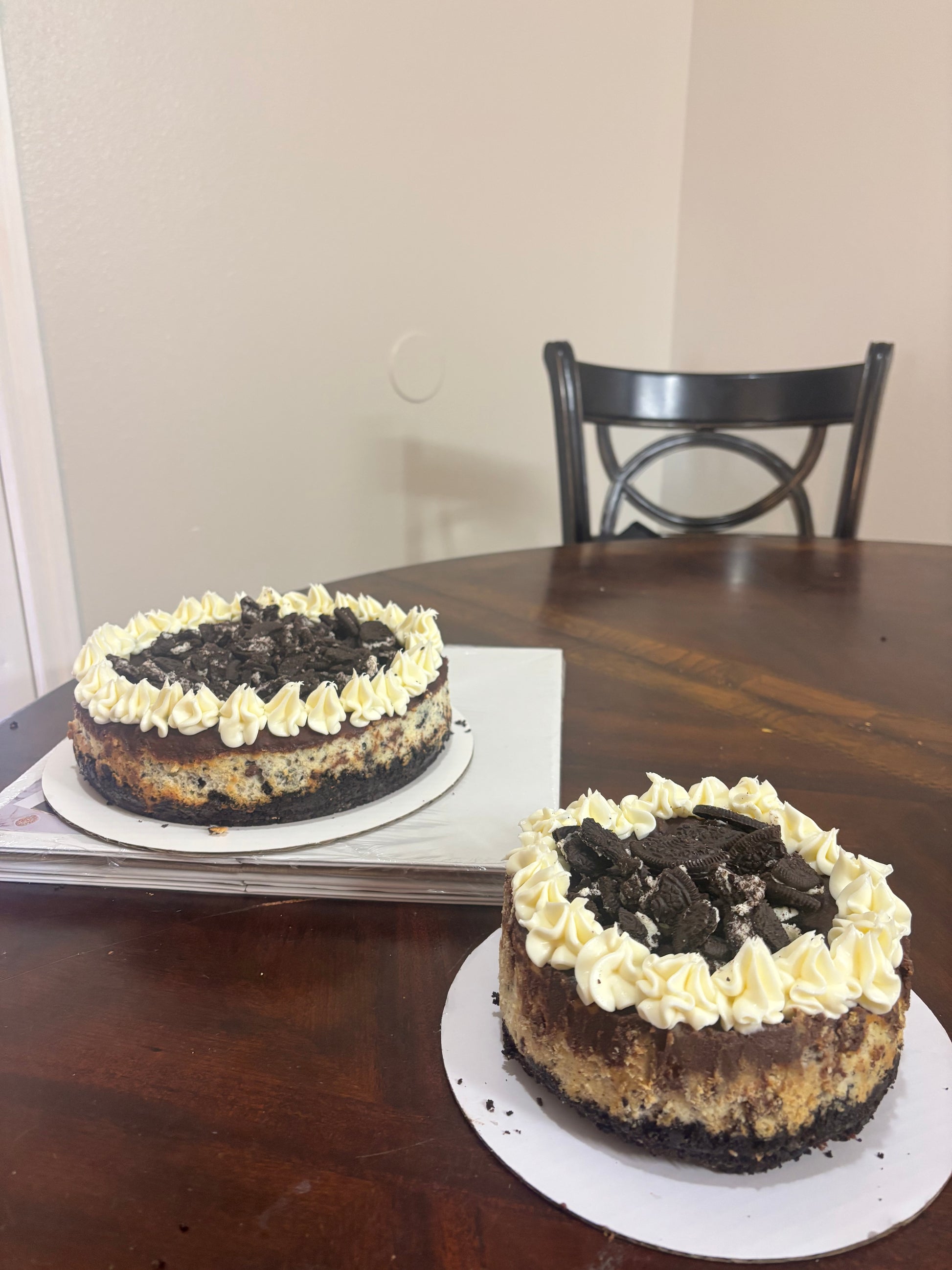 A delicious cheesecake filled with Oreo cookies and sat on a buttery chocolate crust and topped with our homemade chocolate ganache