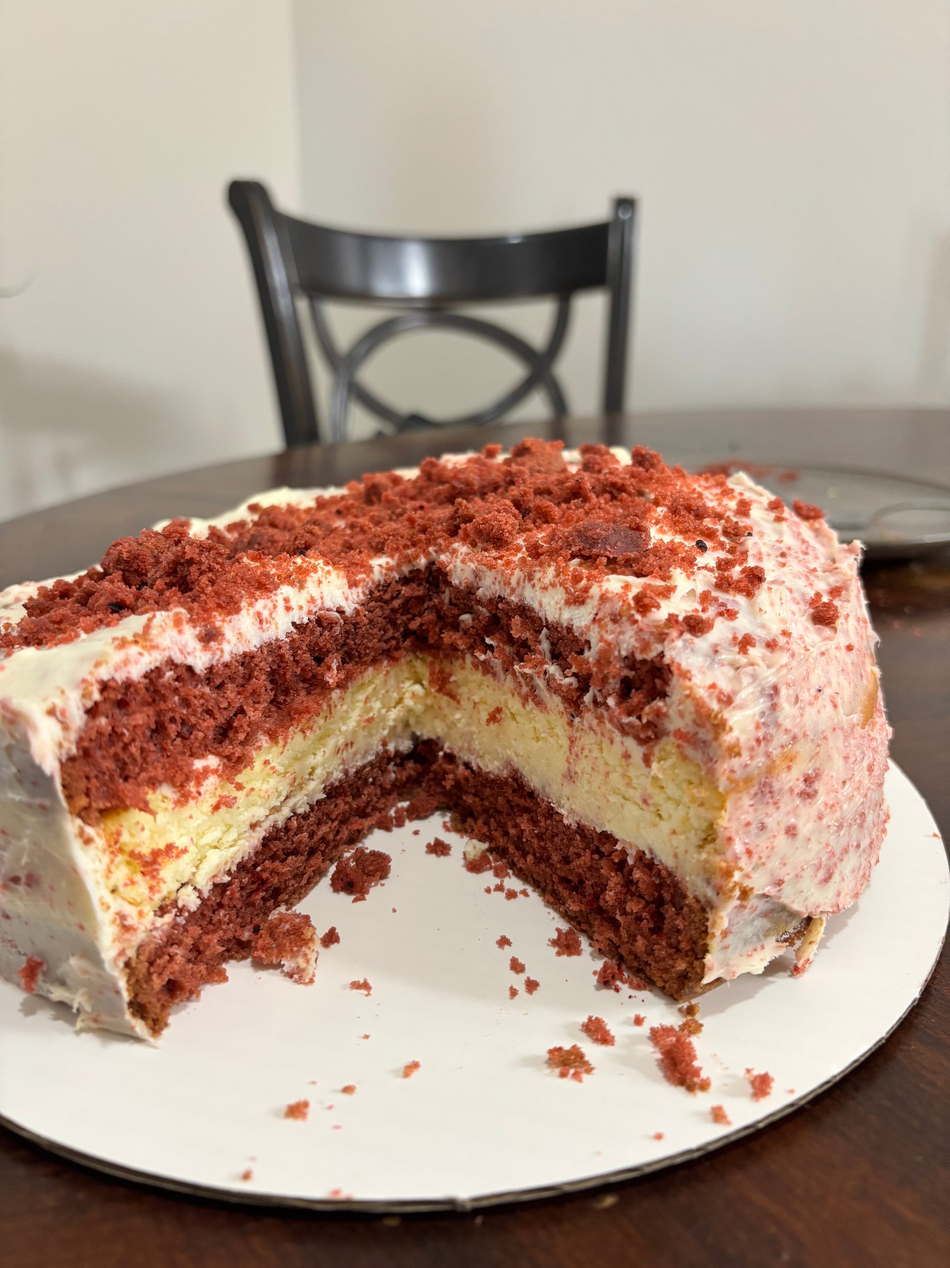 Indulge in the timeless elegance of our homemade Red Velvet Layer Cake, a true labor of love crafted right in our kitchen. Between these decadent layers lies a generous filling of luscious, tangy cream cheese frosting